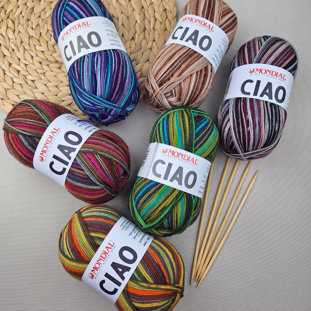 Sockgarn Ciao är ull/nylon-blandning med en ganska hög tvist som ger slitstarka och långlivade plagg. Garnet presenteras i en utvald färgskala med flera tryckta nyanser i en blandning av randigt effekt. Det är det perfekta garnet för att skapa alla typer av sockor – från de enklaste till de mest avancerade