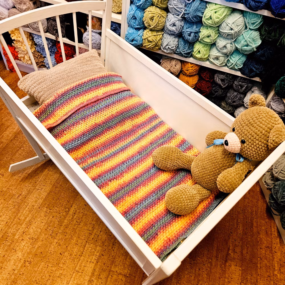 En babyfilt i stl 72x82 cm, 2,5 nystan fg 493, virknål nr 4,5. Virkad av Karolina