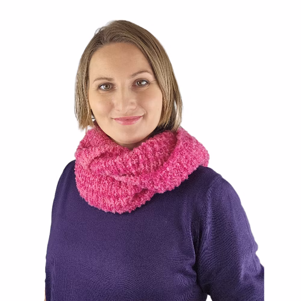 En bild visar stickat tubsjal @madebyhannan. Garnåtgång: 2nys - 100g, färg 741, rundstickor nr 5