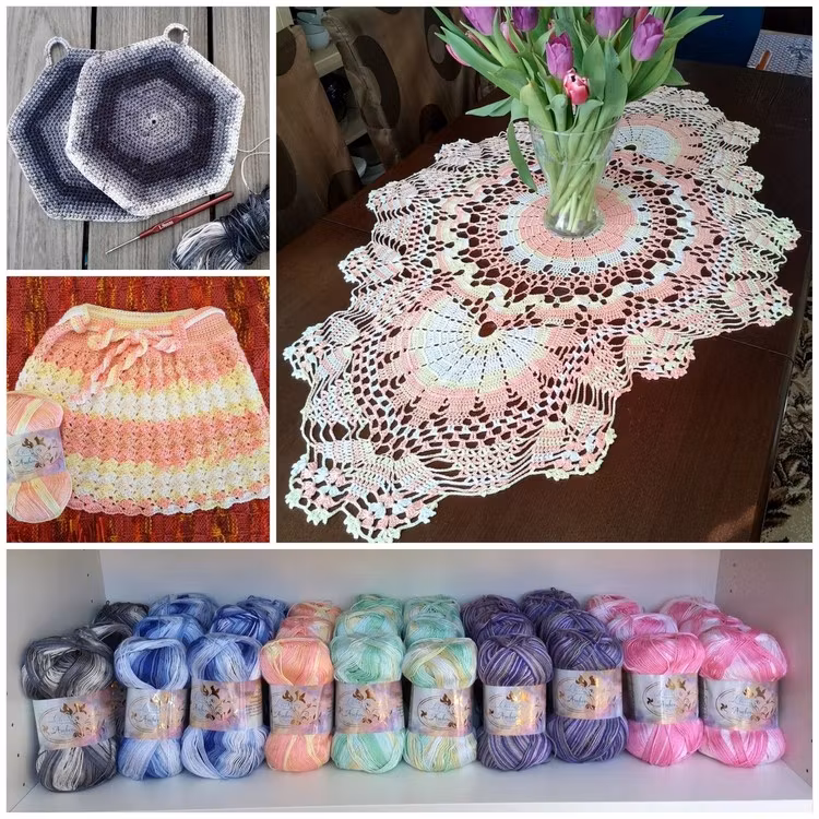 2 st grytlappar i stl ca 19 cm diameter, 25g, färg: grå/vit (S001), virknål: nr 1,9