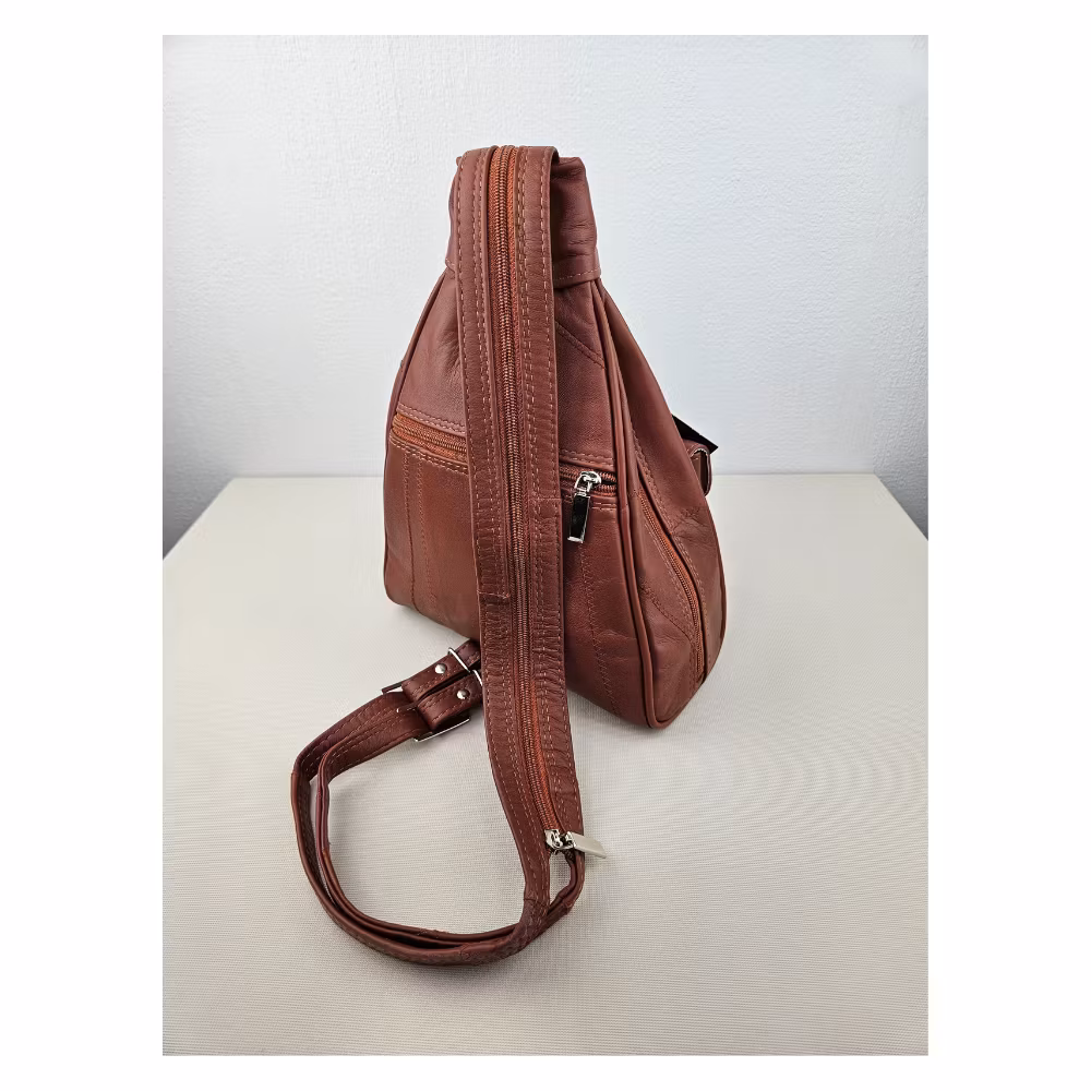 Triangulär ryggsäck i mjukt och lätt skinn som stängs med dragkedja på sidan