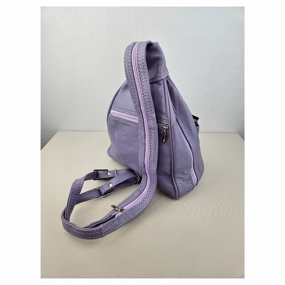 Triangulär ryggsäck i mjukt och lätt skinn som stängs med dragkedja på sidan